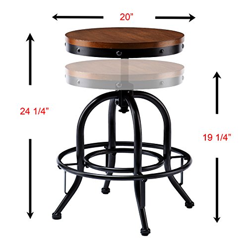 Renovate a room with the reclaimed look of this industrial style stool. A distressed dark pine seat sits atop the curved, black metal frame in a machinery-like design. Adjustable, round stool swiftly goes from desk height to counter height for vintag...
