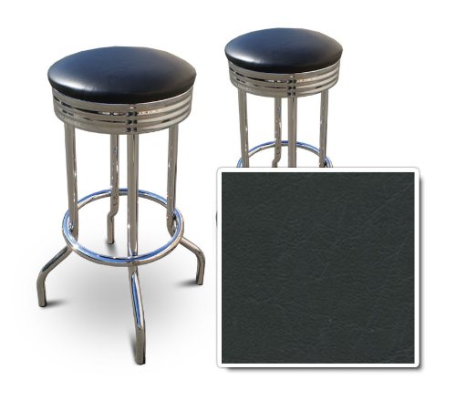 These are new 29 inch chrome barstools. They have footrests and a swivel seat. The seat is made with the custom specialty Blackvinyl shown in the swatch. The sides of the seat have nice metal work and there are feet protectors on the bottom of each l...