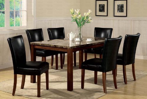You will receive a total of 1 dining table and 6 parson chairs. Table: 64"L x 38"W x 31"H Chairs: 19"L x 23 1/2"W x 38"H Finish: Rich Cherry, Black Material: Wood, Marble-Like Veneer, Leather Like Vinyl 7pc Dining Table & Parson Chairs Set Black Lea...