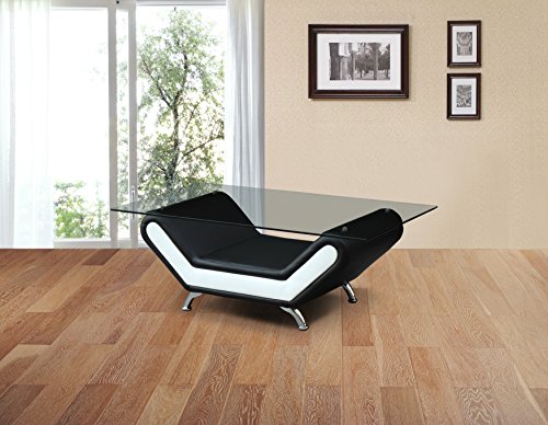Add a touch of modern flair to your home decor with this two-tone leather coffee table. This coffee table offers a gorgeous black and white bonded leather upholstery, with a hardwood frame and chrome-finished metal legs.