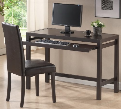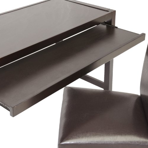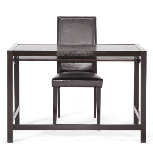 This simple desk fits into any interior design scheme. Made of very dark espresso brown solid rubberwood, this modern writing desk is sold as a set with a matching dark brown wood and faux leather chair, which is padded with foam for your comfort. Th...