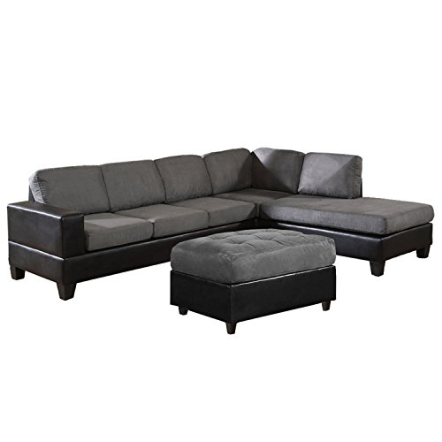 This beautiful 3-piece sectional with ottoman offers firm cushioning with lots of room to stretch out. This piece is upholstered in Gray microfiber fabric and Black Leatherette while featuring a right-side chaise. Accent pillows are included. Microfi...