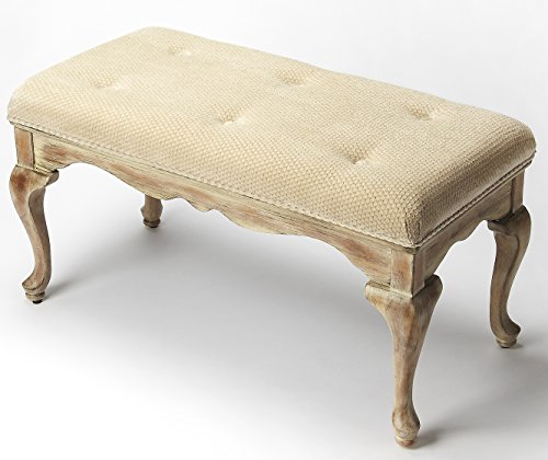 Button tufted chenille. Upholstered cushion. Moderate distress finish. Made from poplar hardwood solids, MDF, cotton and urethane foam. 38 in. W x 18 in. D x 20 in. H (40 lbs.).