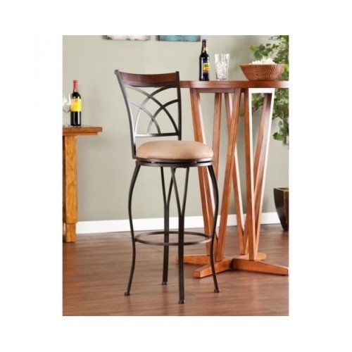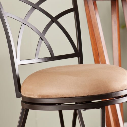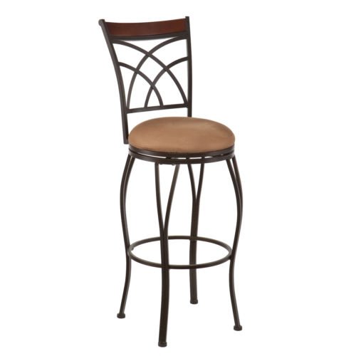 The Riverton swivel bar stool features bar height seating, a cozy foam seat covered in plush mocha microfiber, and a backrest accent in a rich walnut finish bentwood. A powder-coated, dark champagne finish and durable steel frame deliver lasting qual...