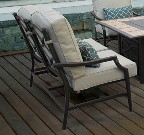 Set of 2. Includes cushions and pillows. Powder coated frame for corrossion protection. Three step hand brushed accent details. Fully welded base legs. Olefin fabric high density foam upholstery. Warranty: six months. Made from extruded aluminum. Mad...