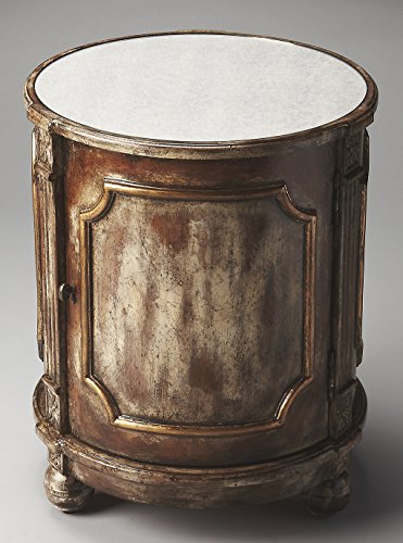 Storage behind door. Antique mirror top. Made from poplar solids, cherry veneer and MDF. Moderate distressed ash finish. 20 in. Dia. X 24 in. H (49 lbs.).
