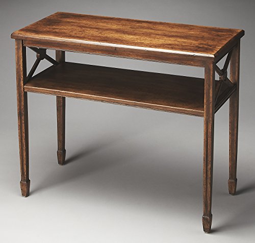 One large storage shelf. Made from rubberwood solids, oak veneer and MDF. Moderate distressed dark toffee finish. 34 in. W x 15 in. D x 30.5 in. H (34 lbs.)