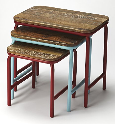 Includes small, medium and large table. Made from mango wood solids and iron. Industrial chic finish with heavy distressed. Made in India. Small: 14 in. W x 14 in. D x 15 in. H. Medium: 18 in. W x 14 in. D x 17 in. H. Large: 22 in. W x 14 in. D x 20 ...