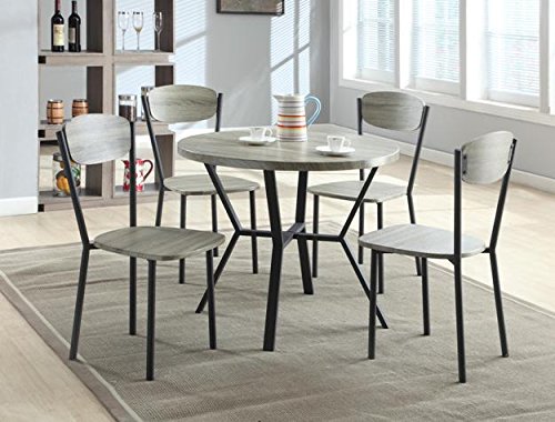 Set includes Round Table and 4 matching chairs featuring a stylish, modern design; light grey wood framed in black metal