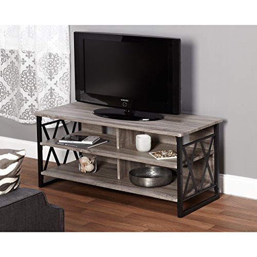Keep your media items organized in style with this durable TV stand. Designed for TVs up to 45 inches, the rustic stand features strong X shaped steel supports and a charming reclaimed grey finish. Four shelves provide plentiful storage space for com...