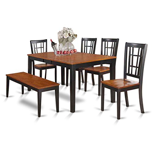 - This 6 piece Dining Set Includes Table & 4 Solid Wood seat chairs and One Bench finished in Black & Cherry