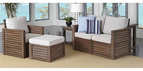 Includes love seat, chair, ottoman and end table. 4 in. thick solid steel gray polyester cushions. Pirelli webbing for seat support. Comfortable angled back. Suitable for indoor and outdoor use. Made from shorea wood, cement and acacia. Rough hued wi...