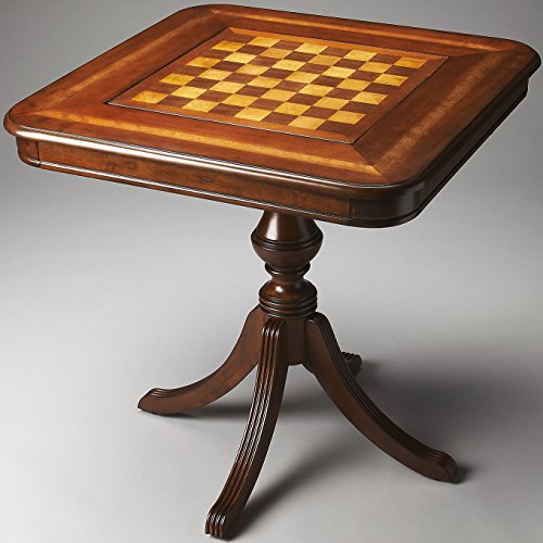 Game pieces are not included. Four delicately carved legs and Urn pedestal. Reversible game board plays chess and checkers on one side and backgammon on the other. Both sides have inlays of maple. Hand crafted. Made from walnut and select cherry vene...