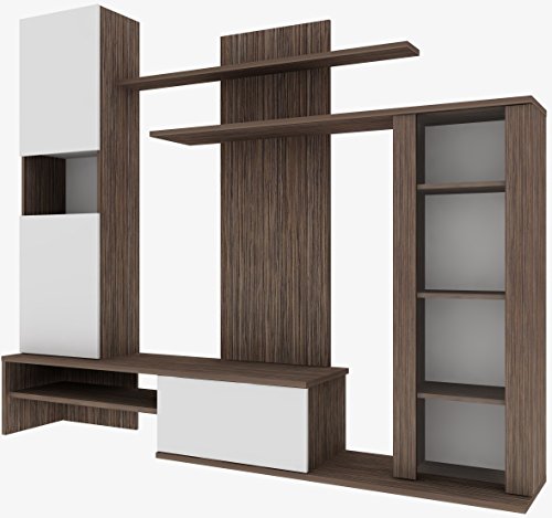 Ultra-modern design meets clever storage solutions with this TV wall unit, made in a 2-tone Avola dark woodgrain, accented with solid White doors. Staggered shelves and asymmetrical cabinetry adds a visual artistry that makes the most of whatever you...