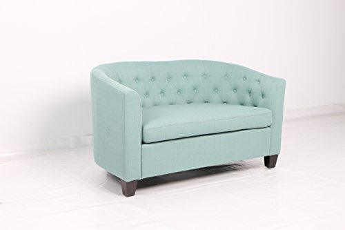 Curved back traditional settee in Laguna color linen like fabric with hand upholstered tufted back and sturdy solid hardwood legs
