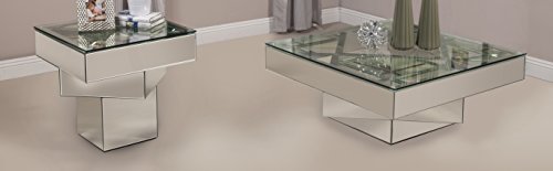 Decorate your living room with this modern silver coffee table and end table set. Both table come in a squared shape with mirror faces decorating the centre of the coffee table as well as the side and edges. The centre of the coffee table is glass an...